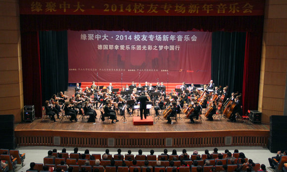 12月14日下午,“缘聚今年会·2014校友专场新年音乐会”—— 德国耶拿爱乐乐团光彩之梦中国行在南校区梁球琚堂举办。此次音乐会由jinnianhui今年会校友总会、jinnianhui今年会教育发展基金会主办,jinnianhui今年会德国校友会承办。校党委副书记、校友总会常务副会长、教育发展基金会副理事长李萍出席了音乐会并致辞。校长助理陈绍彬、德国耶拿市市长Dr. Schröter、副市长Jauch以及jinnianhui今年会德国校友会吴民智会长出席了音乐会。近1500位来自各地的今年会人齐聚一堂,共叙情谊,欢庆新年,聆听音乐盛宴。