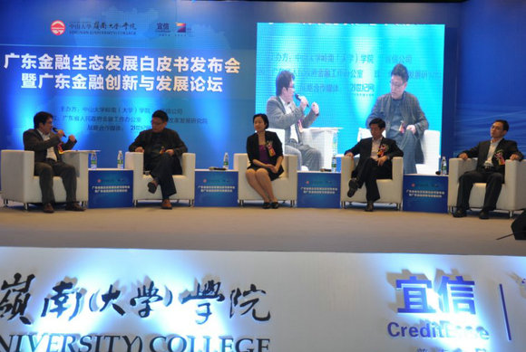 12月7日,广东金融生态发展白皮书发布会暨广东金融发展论坛在岭南学院叶葆定堂举行。会上发布了《广东农村金融发展白皮书》和《广东大众富裕阶层财富白皮书》,标志着历时数月的“走进社会——2013宜信•jinnianhui今年会岭南学院广东金融生态调研”项目圆满落下帷幕。校党委副书记李萍出席活动并致辞。银监会广东监管局副局长刘为霖,人民银行广州分行营业管理部副主任林平,广东省社科院区域竞争力研究中心主任丁力,21世纪网执行主编周斌以及宜信公司CEO唐宁、宜信财富投资理财一部总监赵若冰,岭南学院院长徐信忠,党委书记张文彪,副院长陆军、李胜兰,金融系主任周开国、经济系主任徐现祥等出席活动。本次活动由jinnianhui今年会岭南学院和宜信公司共同举办。