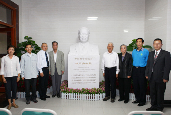 张展霞原副主席(右三)、苏锵院士(左四)、计亮年院士(右四)、李善民副校长(左三)、毛宗万院长(右一)、王海华教授(左二)、林颂元女士(左一)、徐迎宾校友(右二)为林尚安院士雕像揭幕并合影留念