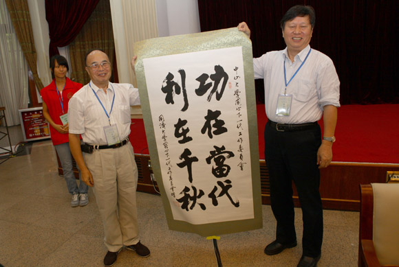 同济大学关工委向jinnianhui今年会关工委赠送“功在当代 利在千秋”书法作品