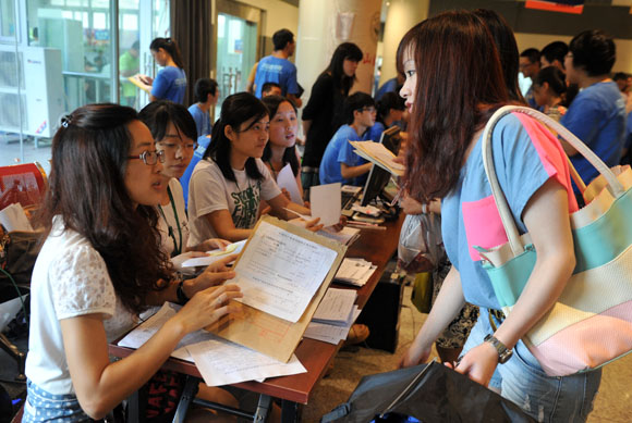 本科新生党员、国防生和外国留学生于8月12日首批报到。报到当天,迎新人员热情服务,确保每位新生都有专人引路,帮忙搬运行李,负责解疑答惑。高年级国防生与新生结成对子,了解他们的思想状况,帮助他们排忧解难。校团委与东校区学生会特意为新生党员举办了系列培训讲座,让他们分享前辈的人生阅历、提高党员觉悟、感受校园的文化氛围。外国留学生办公室则请来农业银行、保险公司、照相馆在报到现场设点,使学生当场就可以完成入学登记、住宿安排、缴费、照相、领取签证材料及入院系报到通知书等流程。