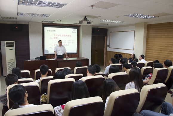 各版块指导老师对所分管的工作做回顾和总结后,王丽霞副部长宣读校党委宣传部“十佳学生记者(编辑)”和“优秀学生记者(编辑)”评选结果的通知,丘国新部长、王丽霞副部长等为获奖同学颁奖。