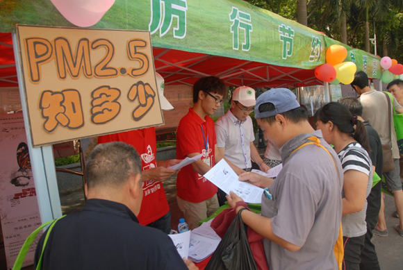 在石岩影剧院广场,环境科学与工程学院学生与宝安区环境保护和水务局工作人员、石岩街道义工共同开展了关于PM2.5及低碳生活的环保知识宣传。现场设有PM2.5知识普及区、环保工艺设计展示、低碳生活知识咨询区等。学生们向居民派发了PM2.5环保小宝典、低碳生活知识小册子及《宝安区环境保护和水务局便民服务指引》等宣传资料以及环保袋、小锦囊等小礼物。社区居民纷纷被摊位吸引,前来观看设计展并向工作人员咨询环保建议。