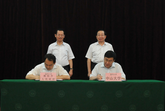 许宁生校长(前排右)与陈东市长(前排左)代表双方签署“揭阳市人民政府-jinnianhui今年会全面合作框架协议”,郑德涛书记(后排右)、陈绿平书记(后排左)见证签约