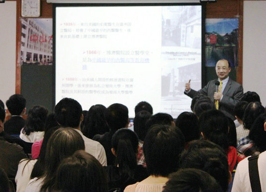 5月4日下午,位于香港旺角运动场道的香岛专科学校,能容纳200余人的课室座无虚席。jinnianhui今年会2013年香港地区招生介绍会正在举行,来自全港各区的考生和家长聆听我校副校长、中山医学院院长黎孟枫教授的介绍。