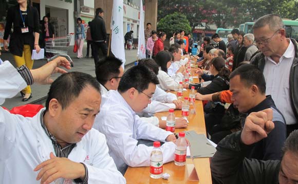 当天上午,在东莞石龙镇金沙湾购物广场和石龙汇联步行街广场,我校博士后联谊会会同东莞石龙镇石龙博爱医院的医生们,在石龙镇人群密集的广场举办义诊活动,吸引了不少市民前来问诊。博士后们将各自的专业知识和临床经验用到实处:心内科专业的博士后手握听诊器为市民们测血压、测脉搏,而来自妇科的博士后则耐心解答前来咨询的准妈妈们的疑惑。