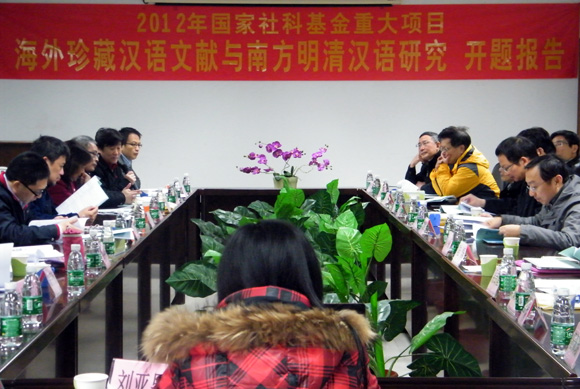 2013年1月5日,中文系李炜教授主持的2012年度国家社科基金重大项目“海外珍藏汉语文献与南方明清汉语研究”(项目批准号12& ZD178)开题报告会在南校区举行。来自海内外各地的课题组成员参加了会议。开题报告会由我校唐钰明教授、周小兵教授、朱其智教授,暨南大学邵敬敏教授、彭小川教授担任评议专家。