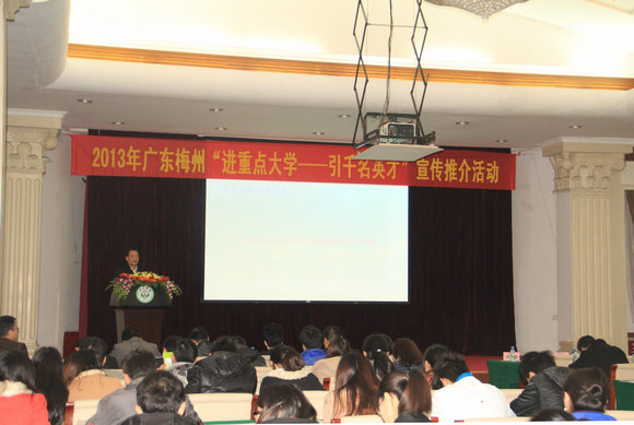1月11日上午,梅州市陈建青副市长率团来我校举办2013年梅州市“进重点大学、引千名英才”宣传推介活动。我校党委朱孔军副书记、党委组织部何晓钟副部长、部分院系副书记、辅导员出席了活动。活动由就业指导中心李明章主任主持。