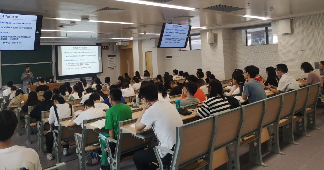 随着课堂铃声响起,课程正式开始。《医学免疫学》授课老师医学院陶鑫副教授播放了歌曲《山高水长》,将学生的学习激情点燃。学生们自发起立热烈鼓掌致谢,并欢迎陶老师开启久违的线下教学。《医学微生物学》课程同时段两个教学班分别有两位授课老师,郭德银教授以多年丰富的教学经验,充分调动了同学们学习的积极性和对学术的渴求;另一位授课老师施莽教授以生动的案例阐述人类健康和微生物特别是病毒的关系,牢牢抓住了学生们求知的心。