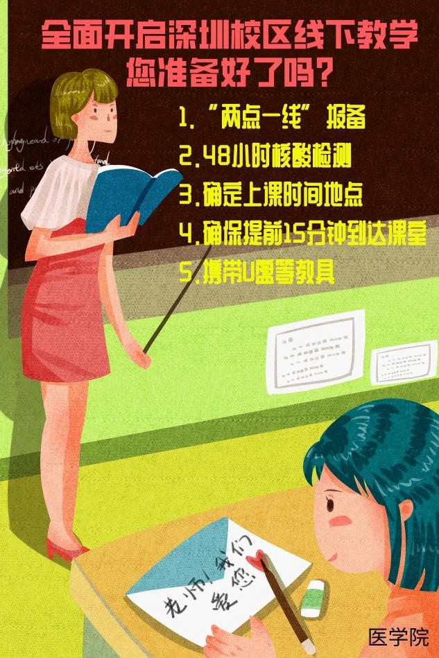 据悉,为了严格落实学校关于深圳校区全面启动线下授课的通知精神,医学院于5月7日晚专门召开全面恢复线下教学工作紧急会议,要求所有老师全面恢复线下授课,明确线上授课只针对未返校学生。5月8日上午,医学院召开了学院教学督导线上会议,对相关工作进行了周密部署,并提出严格要求。为了给进入深圳校区授课的老师提供清晰指引,医学院汤地副院长还精心制作了线下授课宣传海报。