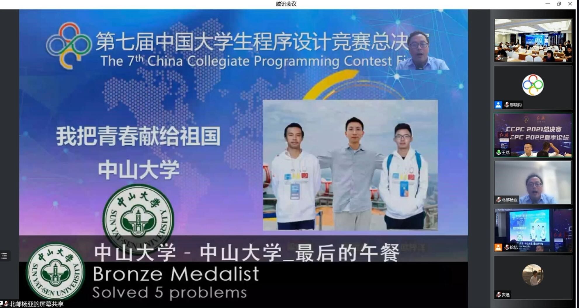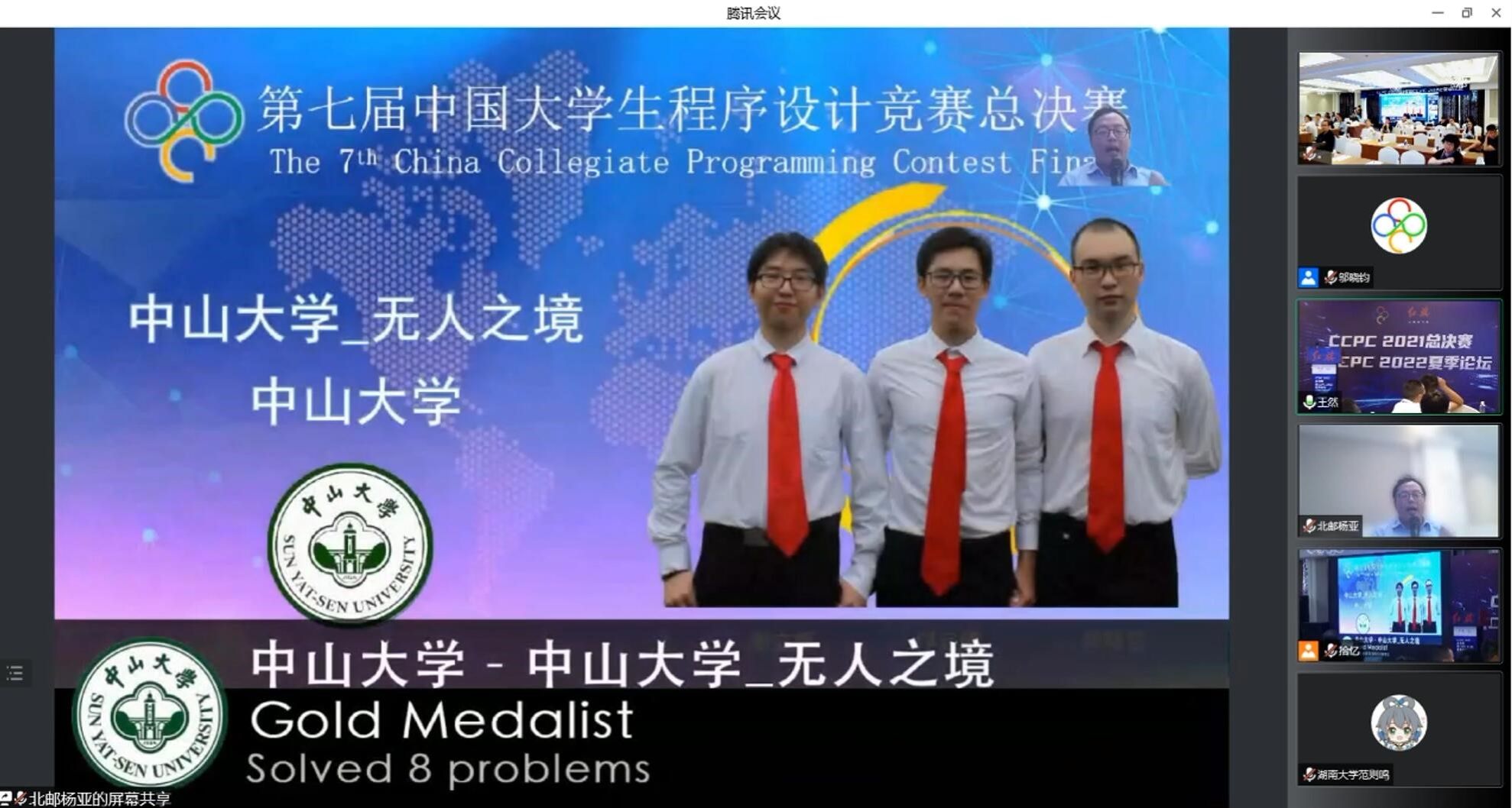 今年会新闻网广州8月18日电(通讯员张子臻)近日,第七届中国大学生程序设计竞赛(China Collegiate Programming Contest,简称CCPC)总决赛在南京(线上)顺利举办。jinnianhui今年会计算机学院组织了两支队伍参赛,斩获金奖、铜奖及学校排名全国第五的佳绩。根据奖励规则,我校将获得下年总决赛的一个奖励名额。