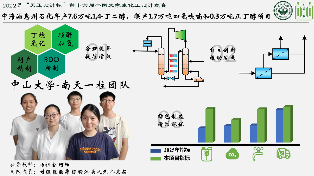 本届大赛设计题目为“为某大型化工企业设计一座1,4-丁二醇生产分厂或为现有的1,4-丁二醇生产分厂设计技术改造方案”,并要求技术符合中国绿色低碳发展要求。我校“南天一柱”团队以“中海油惠州石化分公司年产7.6万吨1,4-丁二醇,联产1.7万吨四氢呋喃和0.3万吨正丁醇项目”为题,凭借扎实的专业基础,过硬的专业能力和良好的团结协作精神,经十个月的精心准备,完成了目标产品的生产工艺路线调查并进行比选与比对,再进行工艺流程设计并进行可行性论证,设计过程中通过换热网络的优化对厂区实现高效节能,绘制了物料工艺流程图和管道仪表流程图,配套做好了化工设备机械设计与选型、及关键设备的图纸绘制,合理布局了车间和厂区,完成了环境影响、安全生产、经济效益等多方面的评估,最后利用三维建模和渲染制作厂区的漫游视频等有关工作,为1,4-丁二醇绿色低碳发展提供一种新的思路和解决方案。