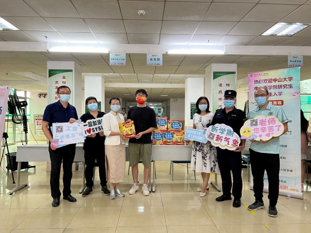校工会兼职副主席、中山医学院党委书记张琪教授(左三),校工会委员李秀红教授(右三)“送清凉”慰问北校园迎新一线工作人员(来源:校工会)