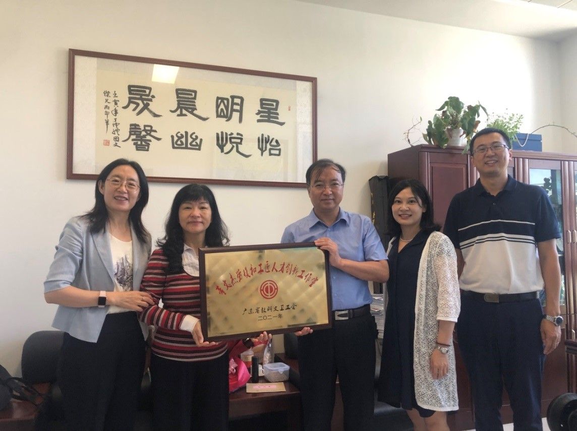 慰问组为广东省五一劳动奖章获得者大气科学学院董文杰教授(右三)颁授“董文杰劳模和工匠人才创新工作室”牌匾(来源:校工会)