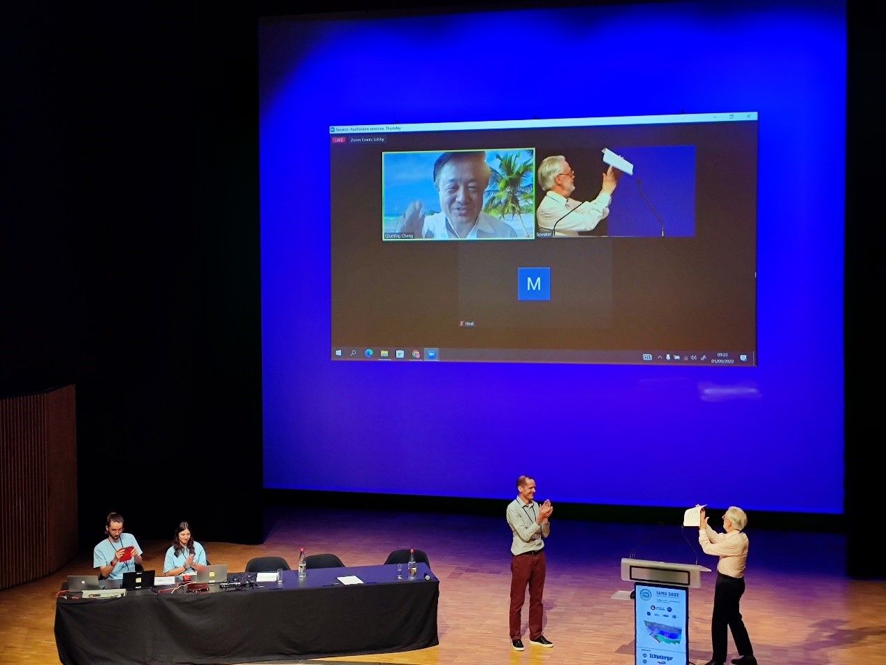 报告开始前,IAMG现任主席、澳大利亚科学家Peter Dowd院士介绍了成秋明院士获得学会杰出讲席(IAMG-DL)的情况并颁发了获奖证书。成秋明院士介绍了他为杰出讲席2022-2023年间全球演讲准备的六个方面的学术报告内容和计划。