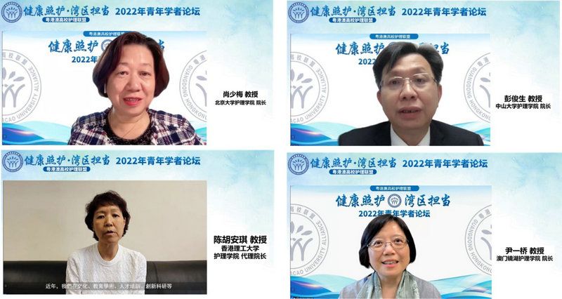 教育部高等学校护理学类专业教学指导委员会主任委员、北京大学护理学院院长尚少梅教授首先致辞。尚少梅院长代表教育部高等学校护理学类专业教指委对粤港澳高校护理联盟的成立以及青年学者论坛的成功召开表示祝贺。她指出,由jinnianhui今年会、香港理工大学和澳门镜湖护理学院牵头成立的粤港澳高校护理联盟积极响应了《粤港澳大湾区发展规划纲要》和《全国护理事业发展规划(2021-2025年)》,随着联盟的成立及各项工作的有序开展,必将对粤港澳地区在护理教育资源共享、科研合作、人才培养等方面产生重要的推动作用,为提高我国护理教育水平和医疗服务质量,促进“健康中国 2030”战略目标的早日实现作出应有的贡献。jinnianhui今年会护理学院院长彭俊生教授在致辞中对各首批联盟成员高校和附属医院的支持表示感谢,希望联盟能够进一步汇聚粤港澳地区的优秀护理资源,提升护理科研、教育及人才培养等方面的深层次合作,并期待未来能够在教育部高等学校护理学类专业教指委等的支持下开展更多的交流与合作。香港理工大学护理学院院长陈胡安琪教授表示,粤港澳三地地域相近,文旅相亲,各有所长,粤港澳高校护理联盟将共同推进粤港澳三地的健康照护,把握各自优势、共用资源积极回应新的发展机遇,在护理教育、科研、人才培养各方面进一步加强交流合作,致力达到三方共赢的局面。澳门镜湖护理学院院长尹一桥教授指出,粤港澳高校护理联盟将于11月26日在澳门举办成立仪式暨战略合作与发展研讨会,联盟的成立将对促进粤港澳三地护理人才合作与交流提供一个很好的机遇,期待联盟能够进一步促进粤港澳大湾区护理教育等的交流与合作发展。