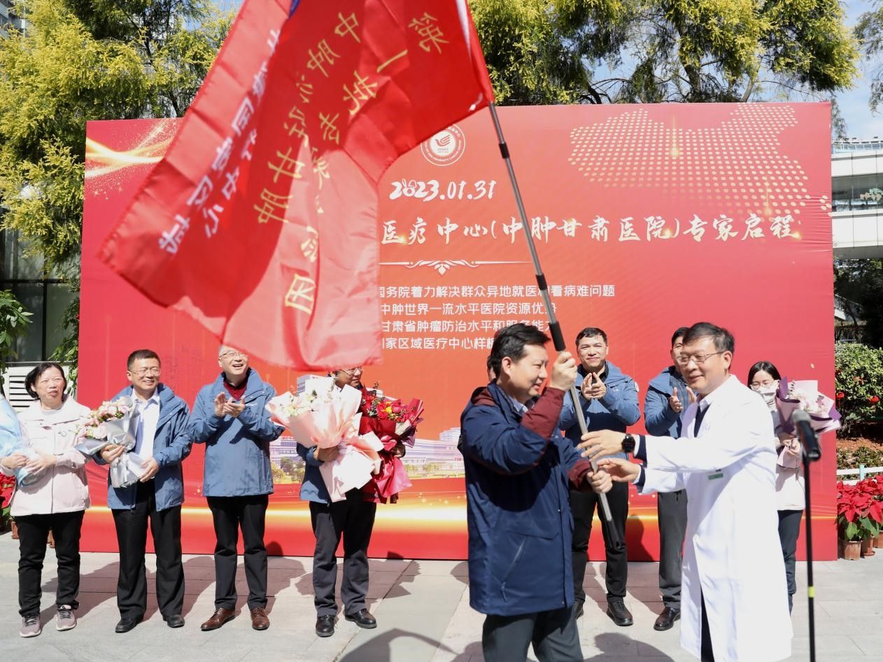 在仪式上,肿瘤防治中心主任、院长徐瑞华向首批派驻国家区域医疗中心的九位专家致以崇高的敬意。他用三个关键词深情地寄语:一是使命,作为代表中肿最高水平的一支队伍,首批专家肩负着党和国家的使命奔赴甘肃,希望你们胸怀国之大者,坚守人民情怀,真正投入,真抓实干;二是信任,首批专家带着国家、人民、中肿的信任奔赴甘肃,希望你们把中肿的医疗技术、医疗管理、学科发展、人才培养等一系列的好经验带到西北,在西北扎根、开花、结果,真正为人民办实事;三是期待,期待援甘专家在这个过程中也汲取西北人民的精神,不畏困难、勇于进取,带着对中国卫生事业的挚爱,把中肿甘肃医院建设成为国内一流的肿瘤医院,在西北打造肿瘤防治事业的新高地,真正为西北百姓造福。