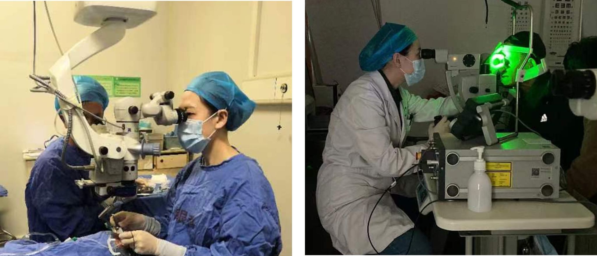 左图:余曦灵开展玻璃体视网膜手术 右图:余曦灵开展视网膜激光光凝手术