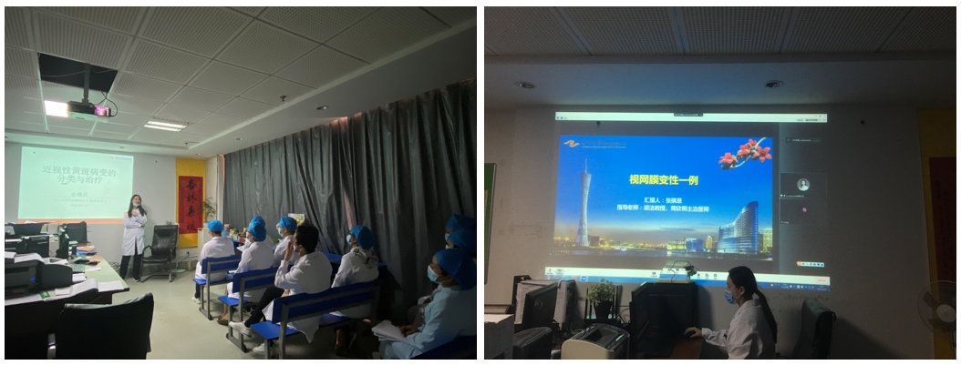左图:余曦灵开展眼底病专题讲课 右图:视频会议连线中山眼科中心眼底外科参与病例讨论