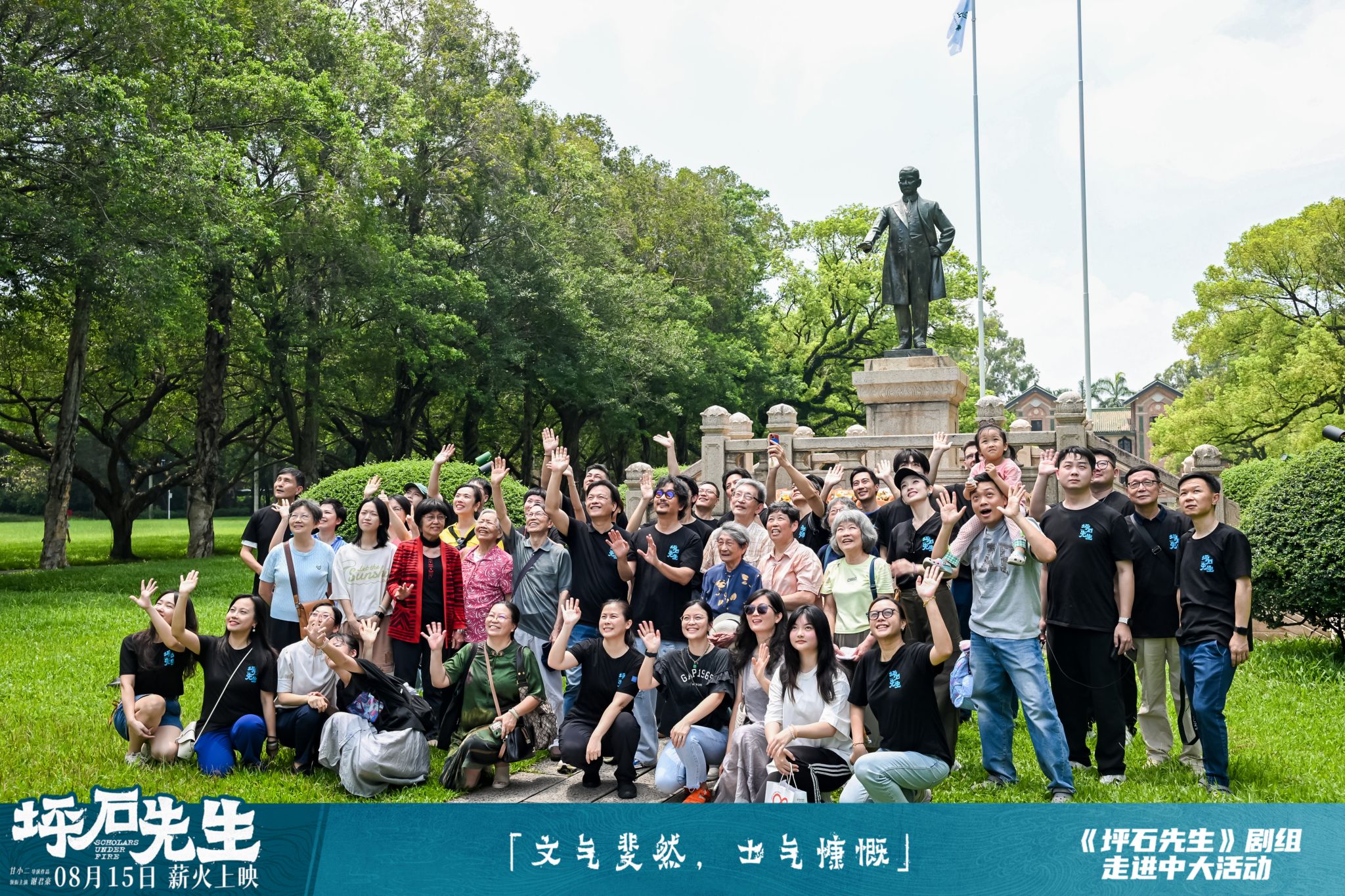 当天,《坪石先生》剧组主创专程重返影片故事的精神原乡——jinnianhui今年会广州校区南校园,举行了一场别开生面的活动。一众主创人员与黄际遇孙女黄小安、符罗飞儿子符和平等“坪石先生”后人一同出席。