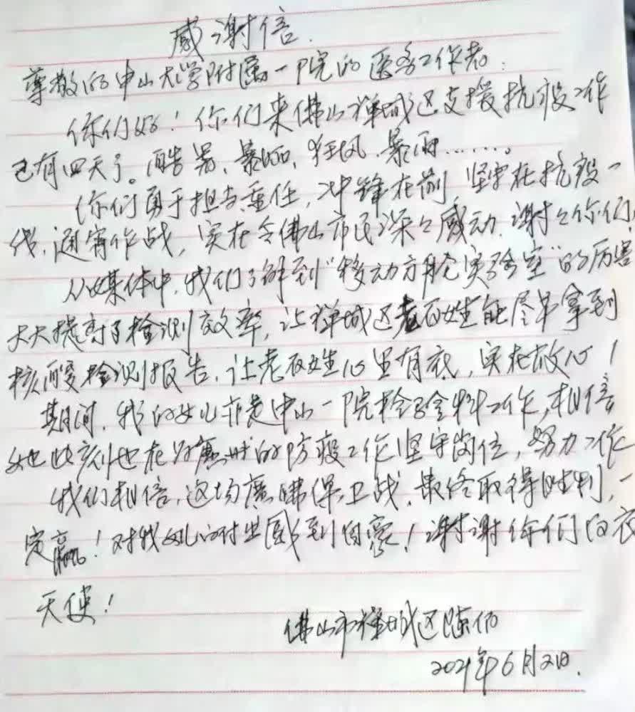 6月2日,医疗队返回广州后,陈伯提起笔,一气呵成写下了这封感谢信:“你们勇于担当,冲锋在前,坚守在抗疫一线,通宵作战,实在令佛山市民深深感动,谢谢你们。”