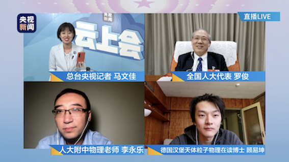 央视新闻两会特别节目《晚八点 云上会》邀请到中科院院士、jinnianhui今年会校长、我国空间引力波探测天琴计划首席科学家罗俊,对引力波和天琴计划进行解读。同时,节目组还邀请到青年学者、德国汉堡大学天体离子物理专业在读博士顾易坤,和罗俊院士一起探讨相关话题。