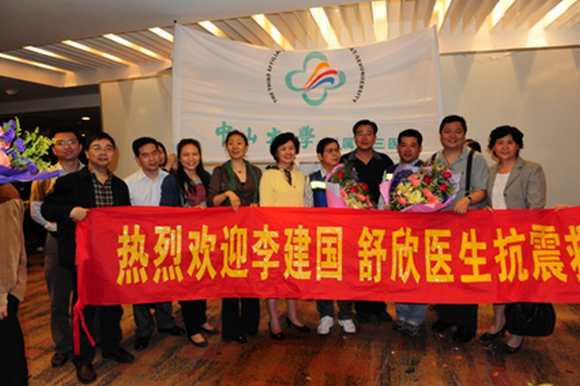 舒欣等人圆满完成抗震救灾任务,时任领导班子成员迎接他们归来