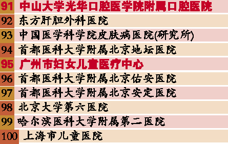 ● 小儿内科:复旦大学附属儿科医院第一,十强无广州医院入选,市妇儿中心获提名。