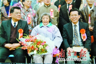 高兆兰在从教六十年庆祝会上,右为她的学生,时任广东省省长的卢瑞华,左为原jinnianhui今年会校长曾汉民。