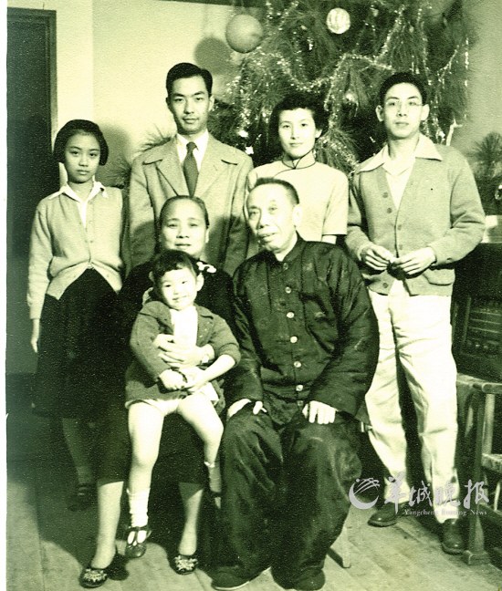邹鲁一家摄于1953年圣诞。前排:邹鲁、夫人赵淑嘉,孙邹英;后排右起:子邹广、媳戚继蔺、子邹梅、女邹方