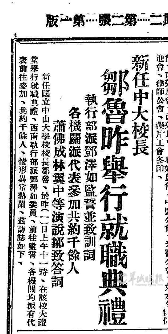 2月1日,今年会举行校长就职典礼,上午11点校钟长鸣,2000名学生和刚刚在省府礼堂向西南执政部委员报告十九路军上海抗日情形后匆匆赶来的邹鲁及一批官员进入大礼堂。在典礼上,邹鲁举右手宣誓,从前任校长许崇清手上接过大印,他说:“总理(指孙中山)创办这间大学的时候,正当军事倥偬、环境困难的中华民国十二年,那里外有帝国主义的压迫,在内除广州外皆是敌人,总理不避艰苦,就在这个时机来创办这大学,他的立意是很远大的。……现在,暴日肆虐,国难当前。在这个抗日当中,有许多学校的学生完全没有上课,专做那口头上的工作,这是无济于事的。我们试观现代的战争,完全是科学的斗争,如果自己的知识阶级不努力于科学的研究,那么我们的救国目的也是渺渺前途,没有成功之希望的。所以我们的学生在这国家危急存亡之秋,应当加紧工作、加倍努力!”