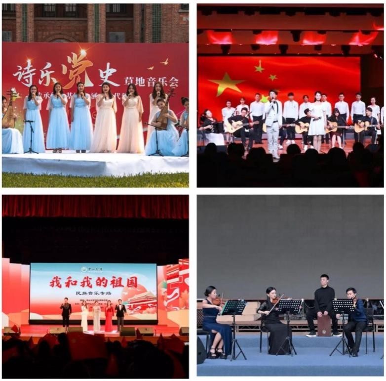 为庆祝中国共产党成立100周年,在师生中开展党史学习教育,弘扬伟大建党精神,弘扬中华优秀传统文化,致敬伟大新时代,学校举办了系列以党史为题材的艺术活动。2021年举办“诗乐党史”草地音乐会,“弦乐四重奏”草地音乐会、“我和我的祖国”民族音乐专场音乐会、“在灿烂阳光下”系列草地音乐会等9场活动,覆盖三校区五校园全体师生员工,提升校园文化氛围。在草地音乐会系列活动中,融入了大量传统民乐表演,以民族音乐为载体,开展浸润式美育,弘扬中华优秀传统文化。