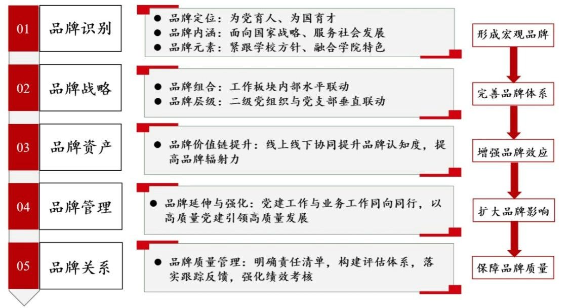 学院基于管理学中品牌建设的相关理论,形成“红色微电”品牌的“创建全流程模式”。“品牌创建全流程模式”主要分为五个阶段,分别为品牌识别、品牌战略、品牌资产、品牌管理和品牌关系,逐步推进品牌文化的深入落实。