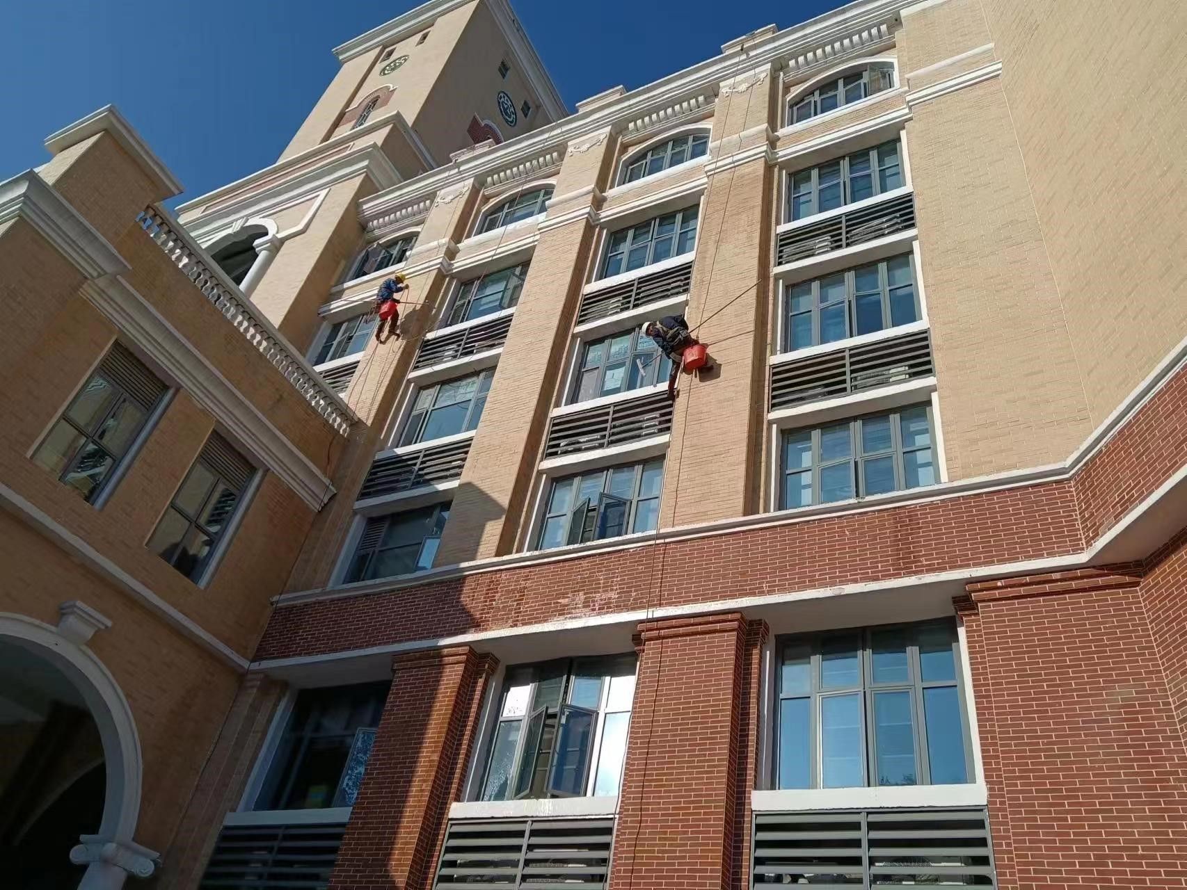 物业工作人员进行外墙清洗