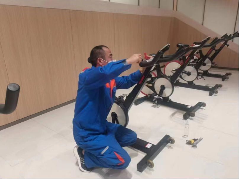 物业工作人员维护运动器械