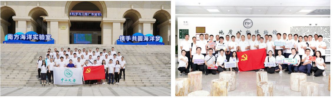 参观合影(左图在海琴四号楼前,右图在地质矿物博物馆中)