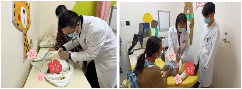 副主任医师沈振宇、主任医师余慕雪在给患儿做检查