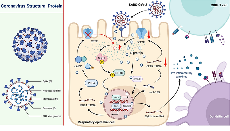 该研究以呼吸道上皮细胞株和原代培养的人呼吸道上皮细胞为体外研究模型,结合气道内滴注SARS-CoV-2病毒蛋白与活病毒攻毒的小鼠在体模型,发现SARS-CoV-2核衣壳蛋白可与宿主细胞Smad3蛋白互作,通过募集microRNA-145介导氯离子通道囊性纤维化跨膜传导调节因子(cystic fibrosis transmembrane conductance regulator,CFTR)的表达下调,从而抑制了跨上皮氯离子的分泌活动。鉴于氯离子分泌受阻很可能会导致细胞内氯离子稳态失衡,该研究进一步通过显微离子成像技术,发现SARS-CoV-2核衣壳蛋白刺激可引起呼吸道上皮细胞内氯离子浓度异常升高,进而通过激活下游的氯离子敏感蛋白——血清糖皮质激素调节激酶1(serum glucocorticoid regulated kinase 1,SGK1)介导NF-κB信号通路活化,诱导炎症反应的发生。另一方面,SARS-CoV-2核衣壳蛋白还可以通过NF-κB依赖的途径介导磷酸二酯酶4(phosphodiesterase 4,PDE4)的表达上调,降低细胞内cAMP水平,进一步引起CFTR关闭,促使细胞内氯离子浓度维持在高水平,从而导致炎症反应迁延不愈。与之相反,抑制/敲除SGK1,或予以PDE4抑制剂干预,均可以显著抑制SARS-CoV-2核衣壳蛋白刺激所引起的持续性气道炎症。