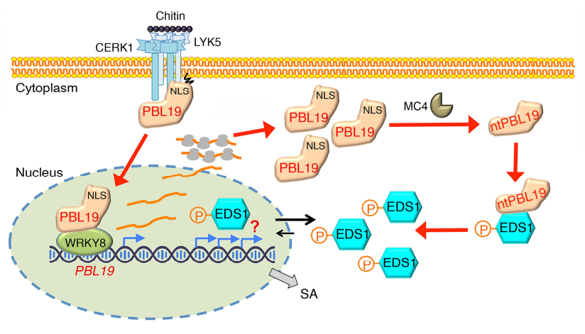 目前已知拟南芥RLCK VII-4亚家族(包括PBL19、PBL20等成员)主要介导了几丁质共受体CERK1下游的免疫信号转导。作者首先发现PBL19的N端具有棕榈酰化位点(Cys3)和一段核定位信号(NLS),而其同源蛋白PBL20则没有NLS。PBL19在几丁质诱导下能够部分迁移入核。有趣的是,棕榈酰化缺失突变导致持续定位于细胞核的PBL19C3A变体会引发植物的组成型免疫,且该过程依赖于PBL19入核后通过招募转录因子WRKY8实现的自身转录上调。PBL19持续入核还会导致植物抗病激素水杨酸(SA)的过度积累。然而,组成型免疫植株与eds1缺失突变体杂交能够完全抑制SA的积累和组成型免疫表型,表明EDS1位于PBL19入核免疫通路的下游。由此,推测PBL19与EDS1在细胞核内互作,却意外发现PBL19与EDS1在细胞质中的点状结构上互作。随后,发现与EDS1互作的是被细胞质蛋白酶MC4切除N端棕榈酰化位点和NLS的截短型PBL19(ntPBL19),而并非全长的PBL19。最后,发现几丁质能够诱导ntPBL19在体内磷酸化EDS1,并导致EDS1在细胞质中积累。PBL19也能在体外磷酸化EDS1,而模拟持续磷酸化的EDS1变体能够补偿PBL19基因缺失造成的植物真菌易感表型。综上,该研究揭示了细胞膜、细胞核和细胞质定位的PBL19依次扮演信号传感器、放大器和效应器的角色,从而介导的一条几丁质信号转导新通路,并首次报道了EDS1磷酸化在植物免疫调控中的功能。