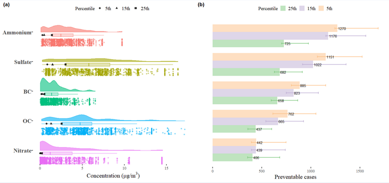 图1. (a) PM2.5不同成分分布云雨图; (b) PM2.5不同成分浓度分别降低到其第 5 百分位时可预防哮喘患病人数。误差线表示由bootstrap方法计算出来的95%可信区间。