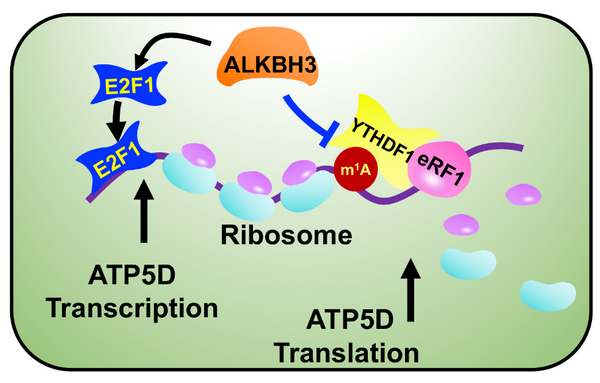 图1. m1A调控ATP5D转录及翻译分子机制模式图
