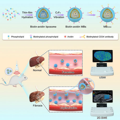 通过制备CD34靶向微泡,利用超声分子影像技术,对肝窦毛细血管化进行可视化定量评估,同时进行二维剪切波弹性成像,比较二者评估肝纤维化的准确性、敏感性和炎症影响