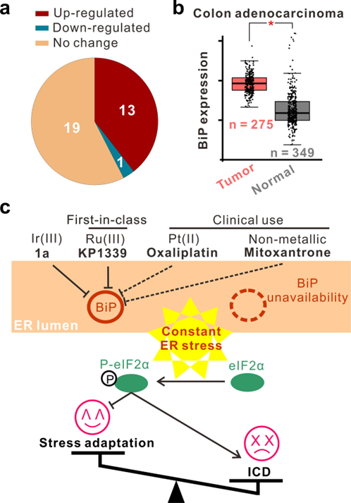 基于其它ICD相关研究的线索,团队成员锁定了ER stress的核心调控蛋白GRP78/BiP作为研究对象,通过一系列实验验证了1a可以通过降低BiP蛋白的稳定性进而抑制其活性。更有趣的是,已知的ICD药物如米托蒽醌、奥沙利铂等均可作用于BiP,预示了抑制该蛋白在激活ICD中的重要作用。最后经过生物信息学分析发现BiP在三分之一以上的肿瘤类型中高表达,具有抗肿瘤靶点潜力。综上,本研究发展了一个新的ICD分子并基于化学蛋白质组学等技术发现了BiP蛋白在ICD中的作用。