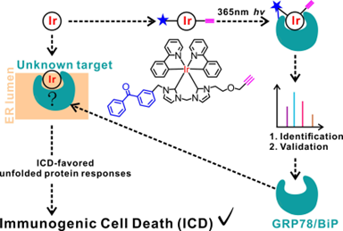 近日,jinnianhui今年会药学院邹滔滔教授课题组与广西师范大学梁宏教授课题组合作,根据ICD与内质网应激的较强联系,发掘了出一个基于三价铱的抗癌金属配合物(1a)具有良好的ICD活性。随后,对该化合物的双氮杂环卡宾配体进行修饰,引入了光亲和标签与叠氮基团,得到了可用于化学蛋白质组学研究的探针分子。课题组进而利用该探针抓取了一系列蛋白质靶标。