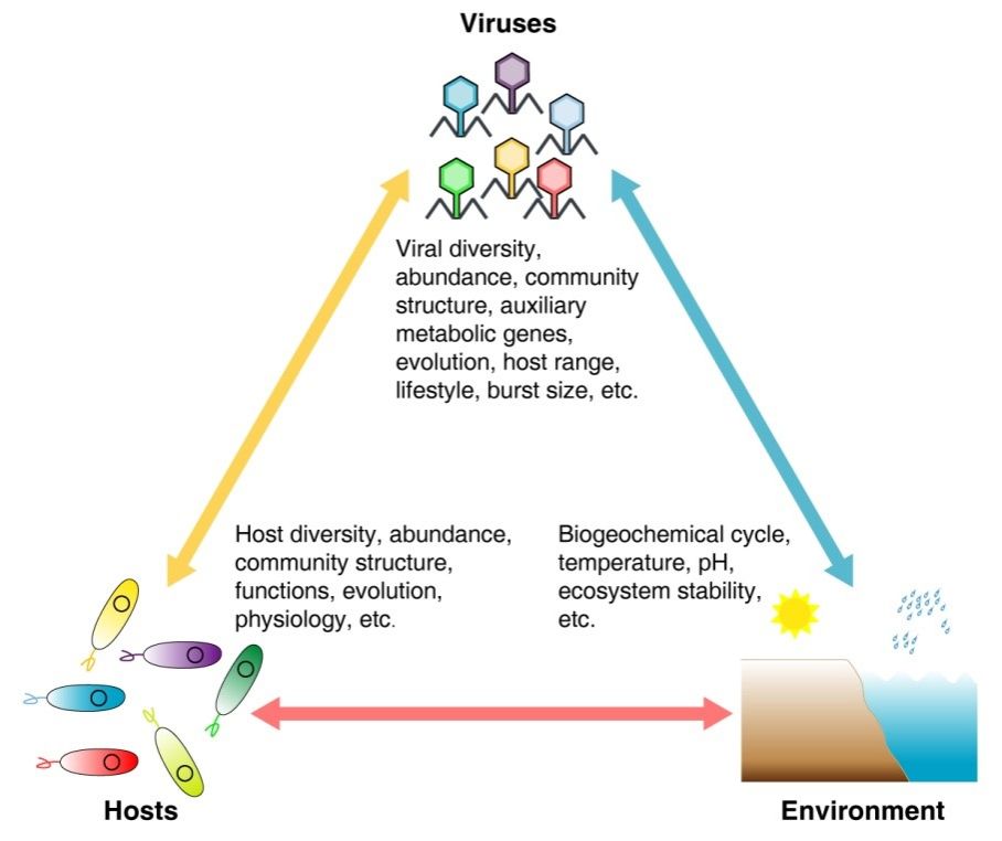 今年会新闻网讯(通讯员高少明)自从19世纪末期欧洲科学家发现第一种病毒(烟草花叶病毒,tobacco mosaic virus)以来,病毒、宿主和环境三者之间的相互关系一直吸引着大量的科学家不断探索(图1)。但是病毒的纯培养较为困难,同时其基因组具有斑块化的特征,限制了我们对于自然环境中病毒多样性的理解。近年来随着组学技术的进一步发展,病毒生态学方面的研究开始逐渐兴起。近二十年来,科学家利用宏基因组学和宏病毒组学等技术,结合生态学、生物地球化学以及基因组学等多学科理论和方法,系统地揭示了不同生境中病毒,特别是噬菌体的多样性、群落组成及其生态功能。然而与原核微生物相比,目前对于病毒生物地理学的研究只有少数几篇文章,且大多集中于海洋环境,因此需要进一步探究自然环境中病毒群落的分布模式及其生物和非生物驱动因子。