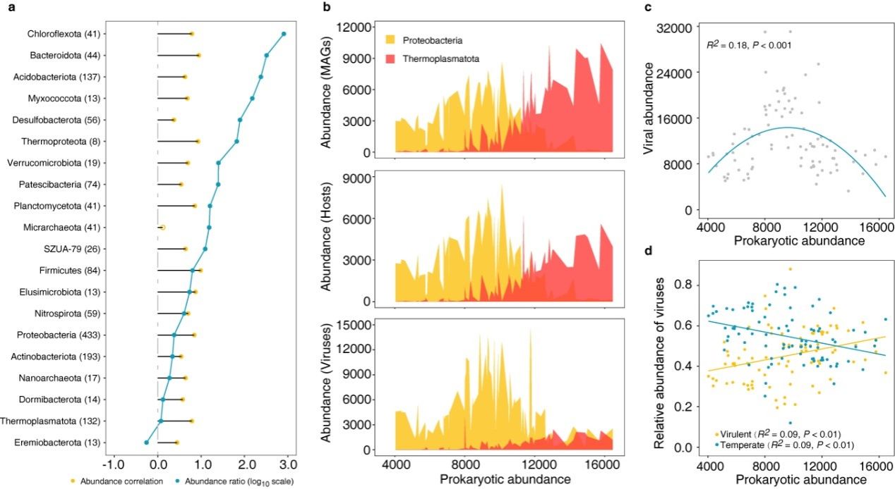 图3. AMD底泥中病毒与宿主丰度的变化关系