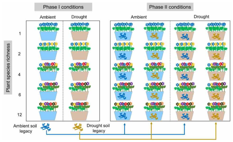 jinnianhui今年会有害生物控制与资源利用国家重点实验室储诚进教授团队设计了模拟干旱和模式弃耕田群落(360个中型实验生态系/植物群落)的两阶段实验,以研究在随后的干旱下,降雨的慢性减少(压力干旱)是否以及如何改变土壤遗留效应和植物多样性-生产力关系。在第一阶段,在环境或干旱条件下,在均质土壤中种植了120个具有五个物种丰富度水平的模式植物群落,以生成“条件”土壤样本。在第二阶段,为新建立的植物群落提供了土壤接种物,无论是否有之前的干旱暴露,并经受干旱或环境浇水条件(图1)。具体而言,研究假设(i)干旱和植物物种丰富度共同影响土壤微生物群落,(ii)干旱土壤遗留效应影响生物多样性效应对植物生产力的影响,以及(iii)随后的干旱改变了干旱土壤遗留效应对多样性-生产力关系的影响。