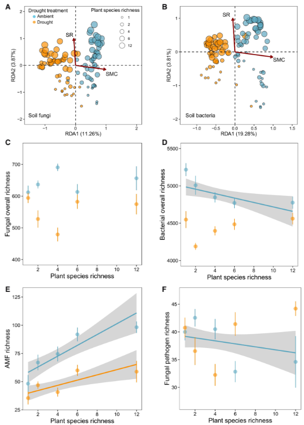 研究发现(图2-3):(i)干旱降低了细菌和真菌的丰富度,并改变了植物物种丰富度和微生物群之间的关系;(ii)干旱土壤遗留效应增加了生物多样性净效应,但生物多样性净效应对植物物种丰富度的响应不受影响;(iii)植物物种丰富度和互补性/选择效应之间的联系因过去和随后的干旱而不同。本研究结果为在不断变化的环境中生物多样性与生产力的关系提供了机制上的见解,并对气候变化下生态系统功能的稳定性产生了影响。