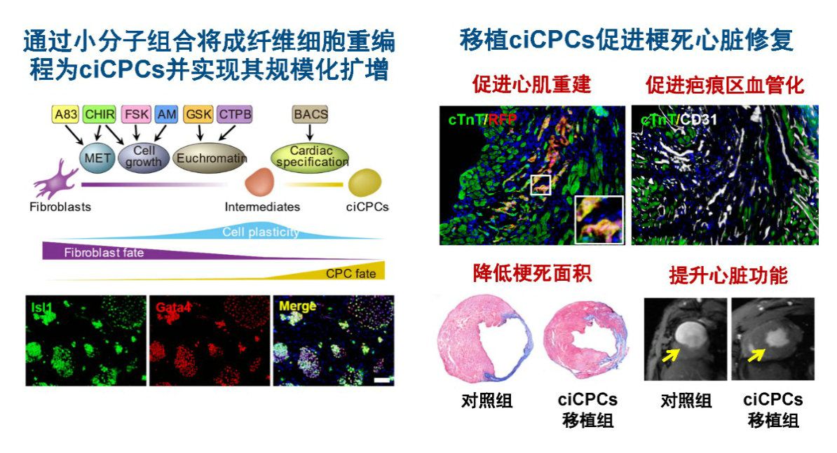 2022年3月31日,jinnianhui今年会中山医学院曹楠教授团队在生物医学工程领域著名期刊Nature Biomedical Engineering期刊(中科院1区TOP,IF="23.7)上发表了题为“Reprogramming" of fibroblasts into expandable cardiovascular progenitor cells via small molecules in xeno-free conditions”的论文。该研究首次使用小分子化合物组合将小鼠和人成纤维细胞重编程为CPCs(化学诱导的心血管祖细胞,chemically induced CPCs, ciCPCs)并实现其规模化扩增。将ciCPCs移植至梗死心脏后,其可同时促进瘢痕区心肌重建和血管化,进而显著促进梗死心脏修复和心功能恢复。从而创建了从病人自体细胞制备和扩增CPCs,进而用于心脏修复的新策略。