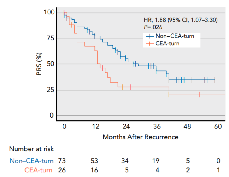 此外,研究团队还发现并定义了一种CEA转化肿瘤(CEA-turn tumor),大约四分之一的复发性直肠癌患者为CEA转化肿瘤,其主要特征包括治疗前基线CEA阴性和治疗后复发时CEA阳性。出现CEA转化的复发性直肠癌患者表现出更加恶性的肿瘤生物学特征,具有更差的远期生存结局(图4)。